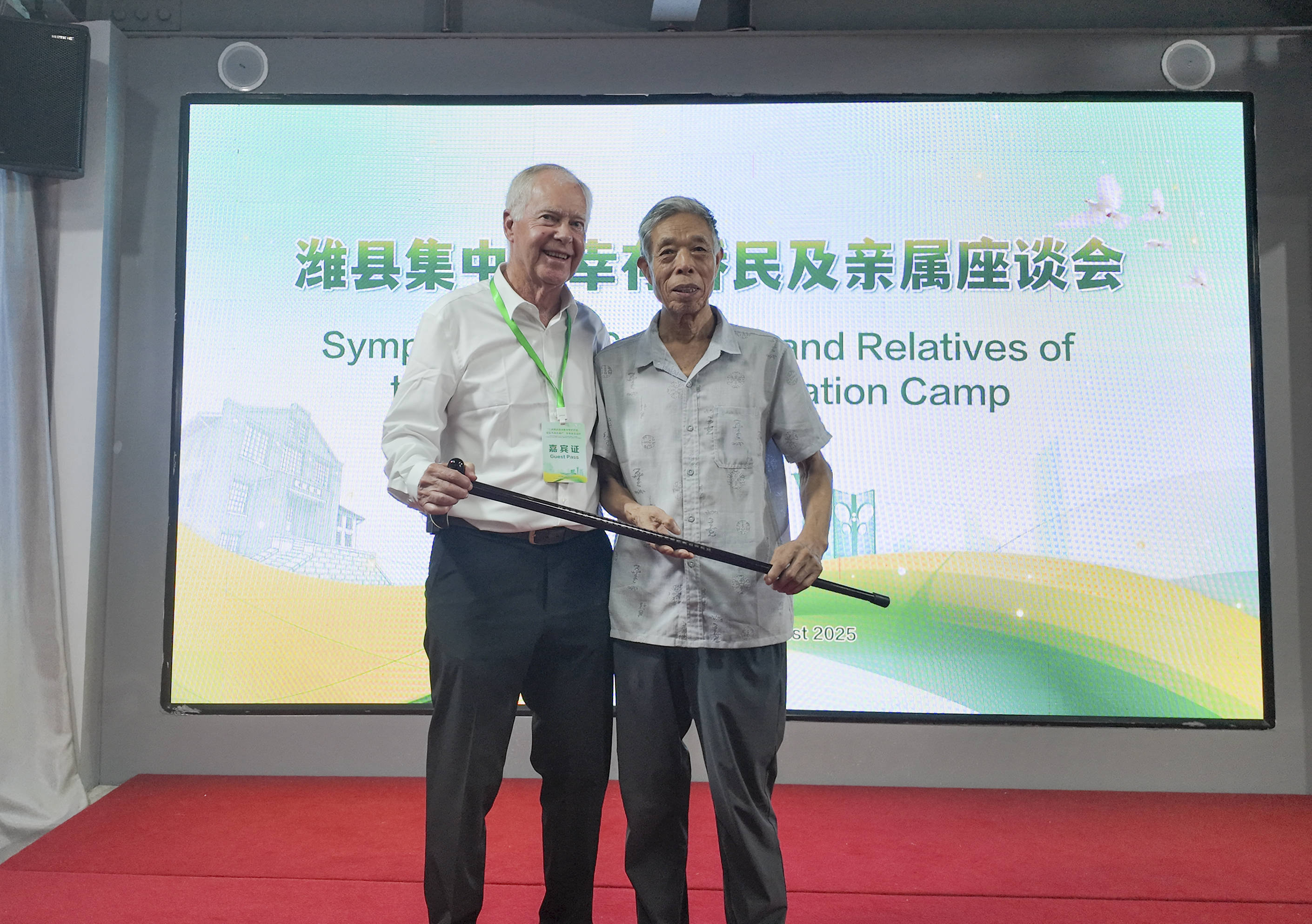 潍县人后代韩崇滨(右)把女儿雕制的红木嵌银手杖送给查理·斯坦利,手杖上刻有不同写法的“寿”字(8月17日摄)。新华社发(潍县西方侨民集中营旧址博物馆供图)2019年,韩崇滨来到博物馆,说要将一张保存了几十年的铁床捐赠给博物馆。“当年,我父亲看侨民们可怜,凑钱买了些糖,又从家里拿了鸡蛋,想方设法把这些东西送进了集中营,侨民把一张铁床拆卸后送了出来。”韩崇滨说,“父亲压根不知道给外国人送物资还会得到‘报酬’。”
